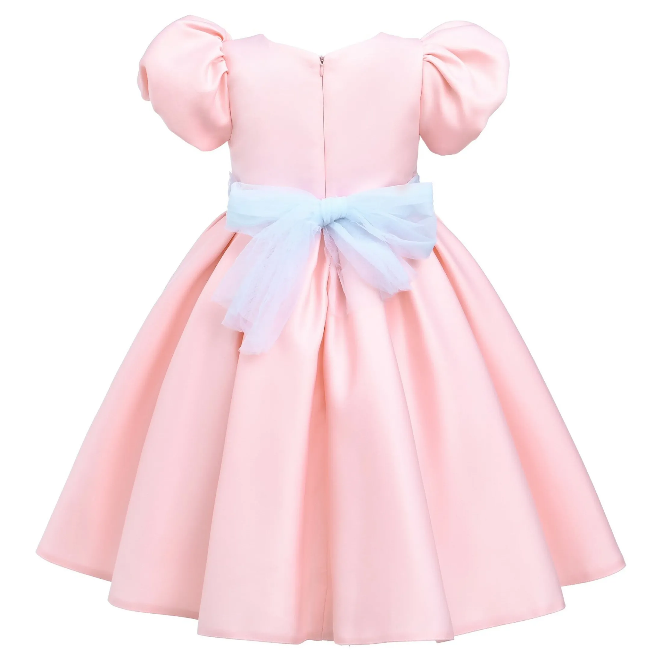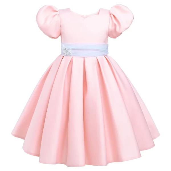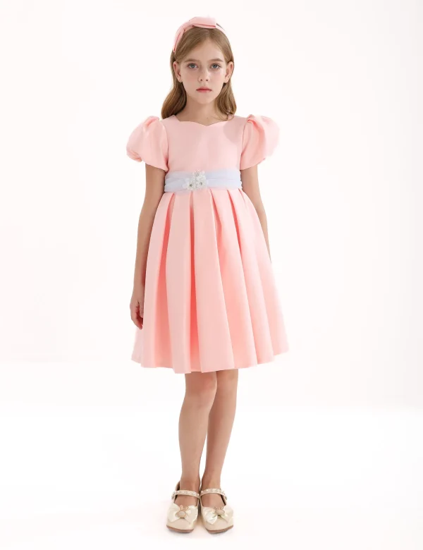 The Pink Easton Teacup Belt Dress for kid girls from Tulleen is a beautifully designed piece that exudes elegance and charm, perfect for any special occasion. This dress features a sophisticated puff shoulder bodice, adding a touch of vintage-inspired flair. Firstly, the grey tulle belt with a floral embellishment provides a striking contrast and enhances the dress’s refined look.