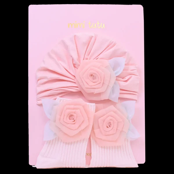 It features an adorable head accessory adorned with charming pastel roses, beautifully paired with matching socks for a coordinated look. This enchanting gift set combines style and comfort, making it an ideal choice for any occasion.