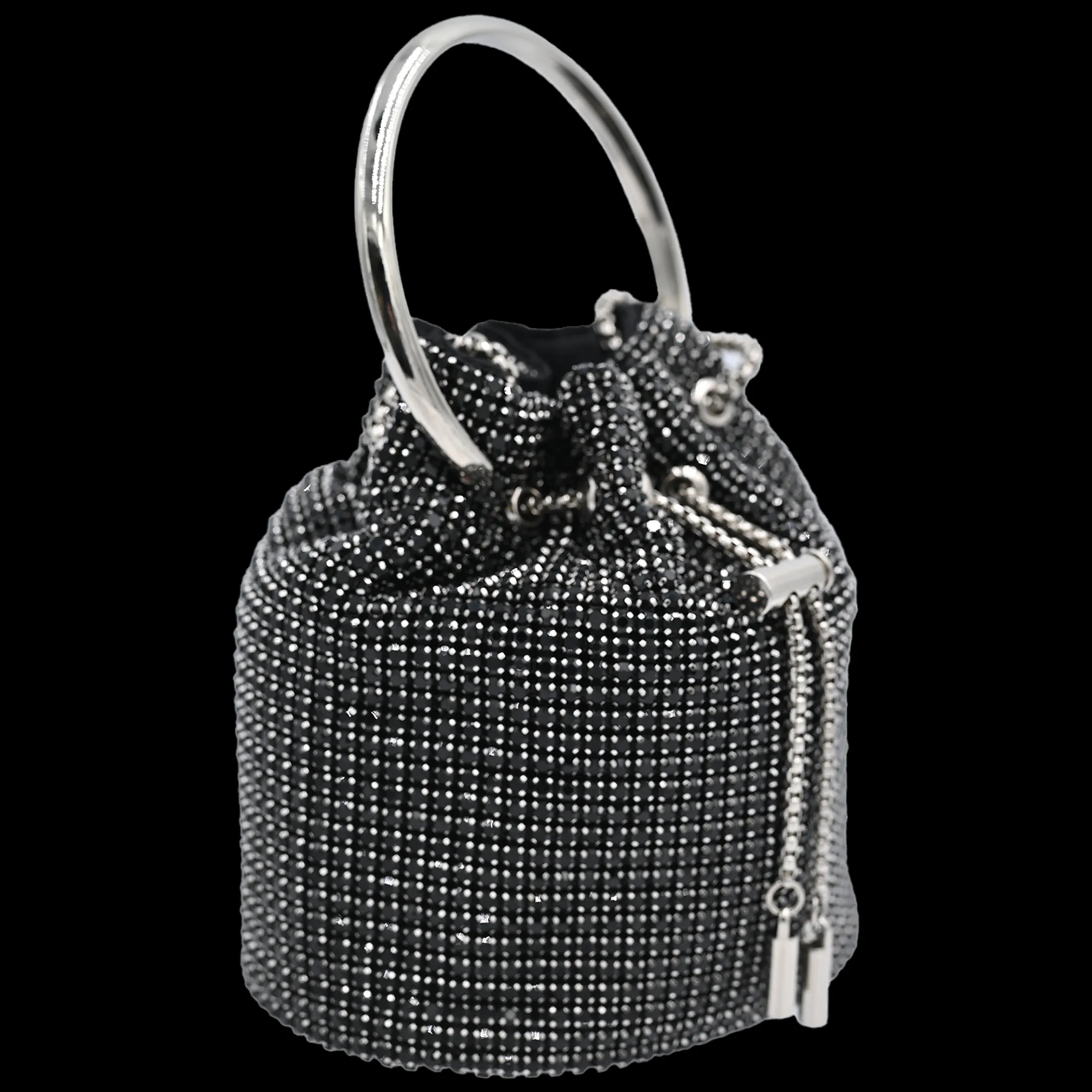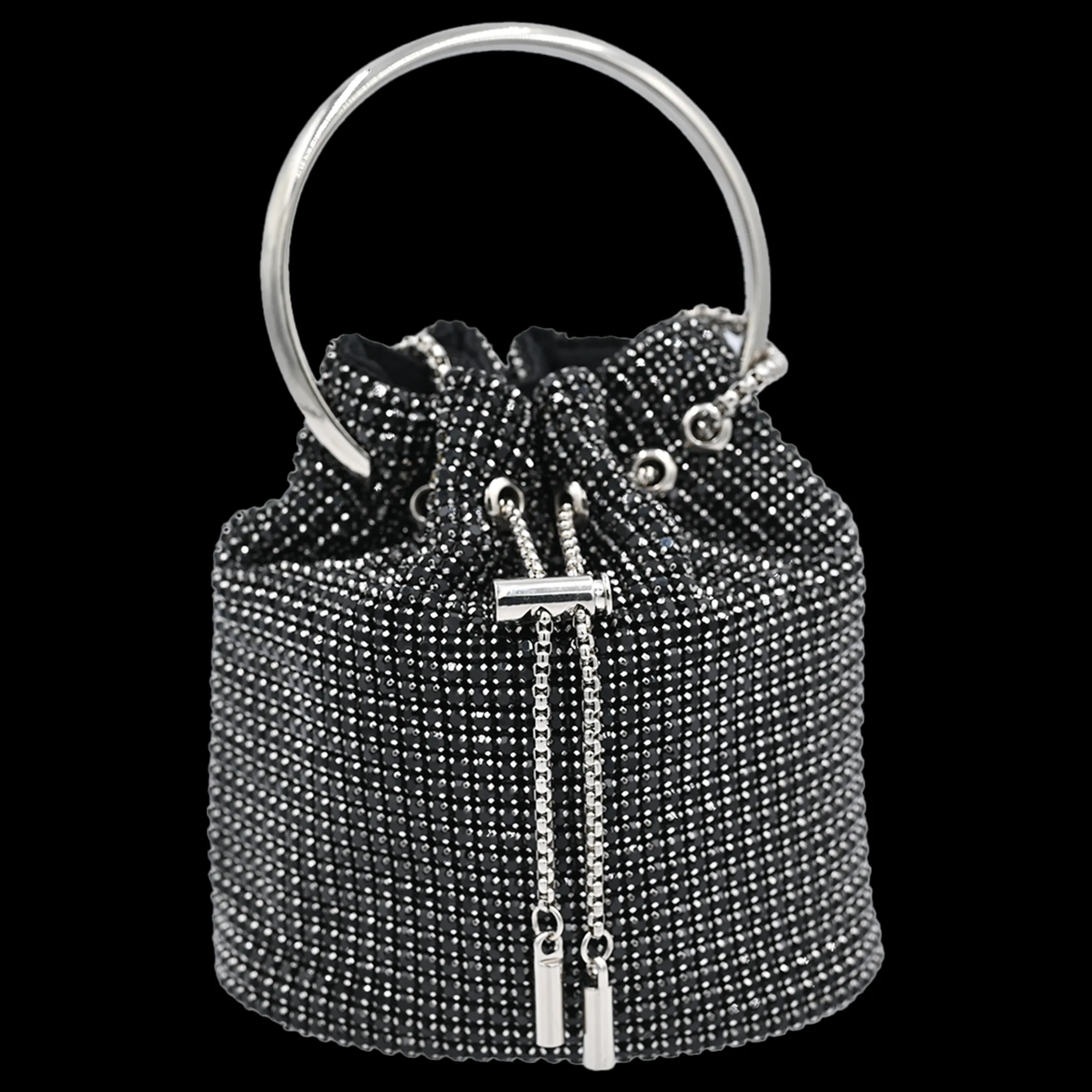 Designed with both style and convenience, it features a drawstring closure for secure storage and a polished shoulder chain for easy carrying. The bold black color and sparkling details make it a versatile piece, perfect for special events or adding a touch of glamour to everyday outfits.