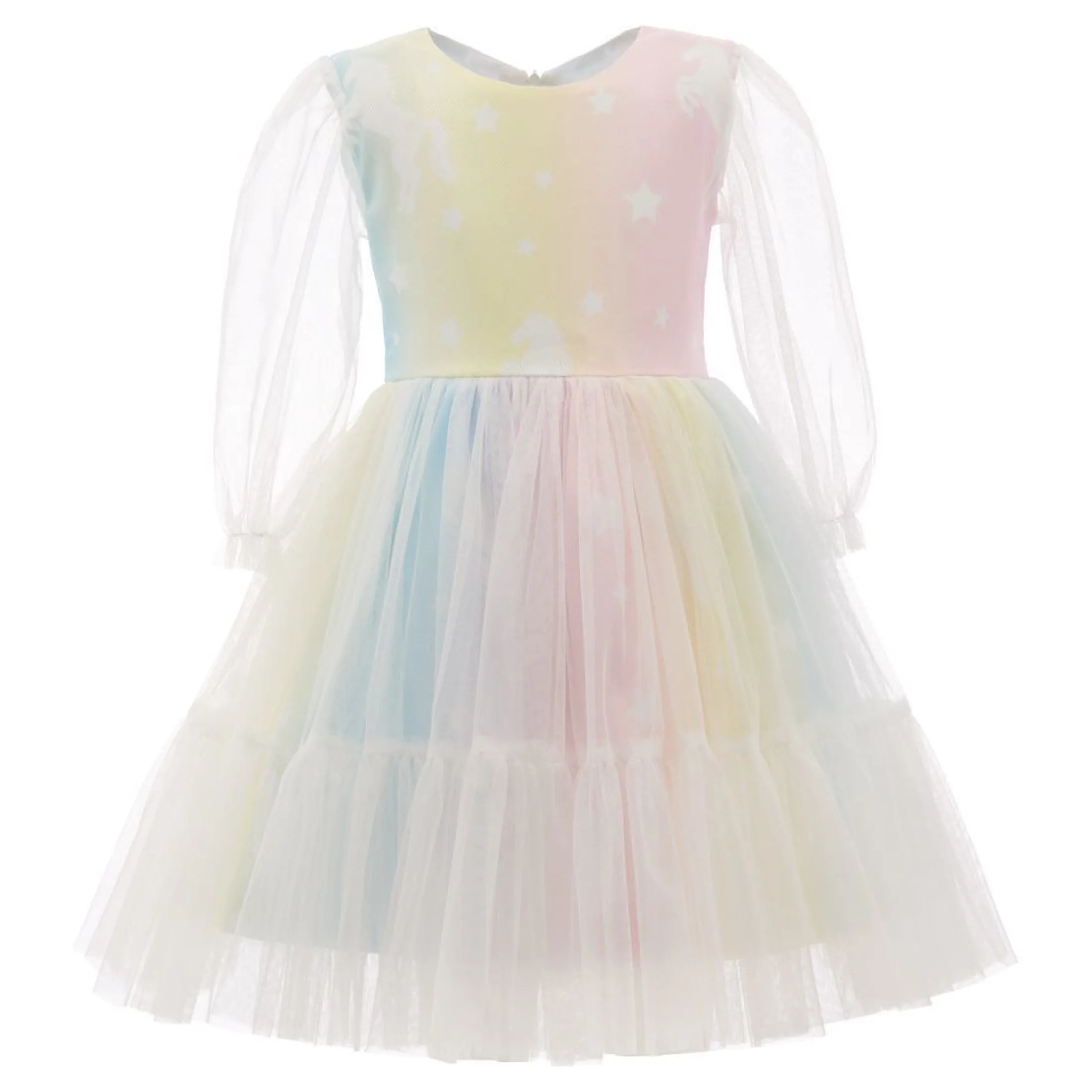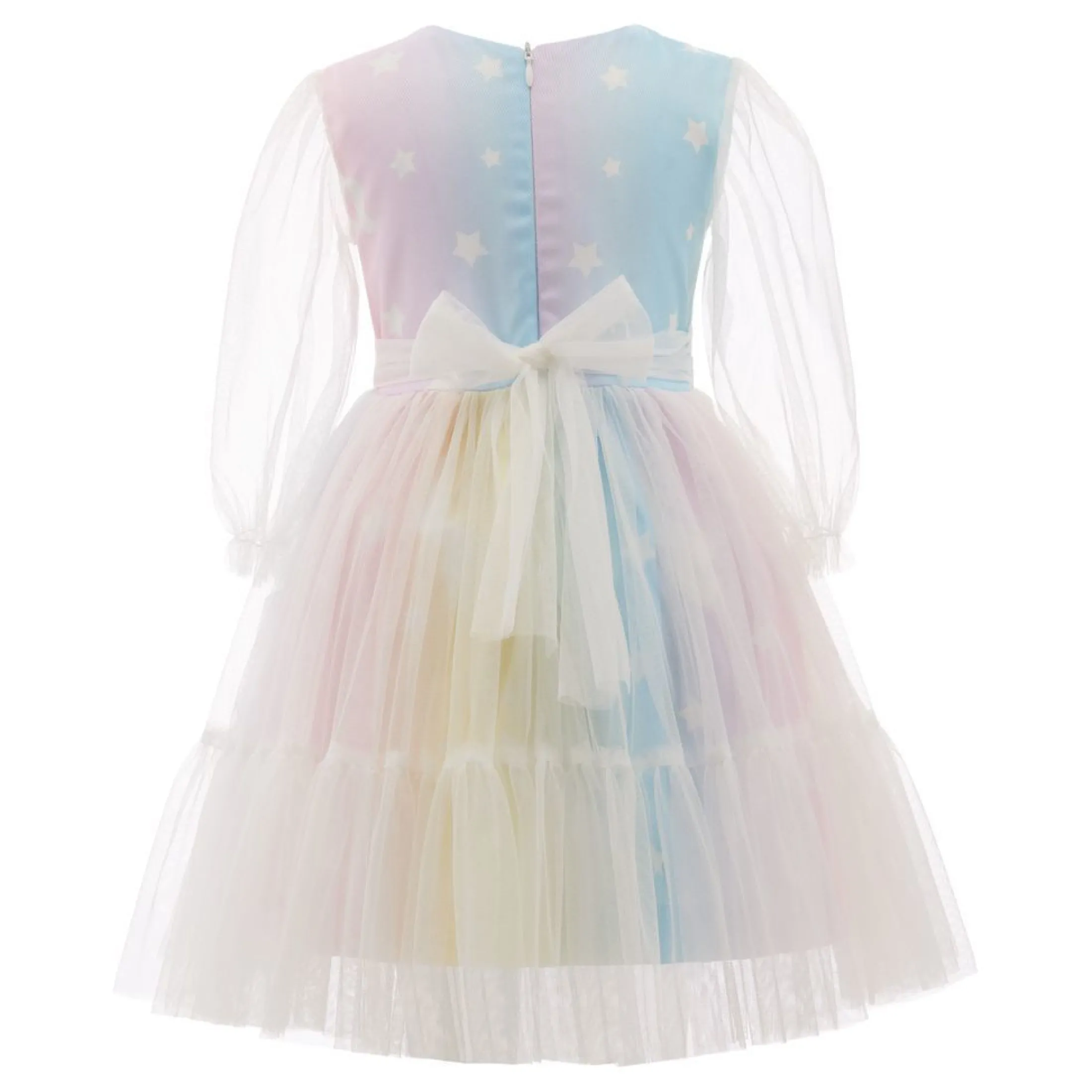 The Multicolor Fantasia Rainbow Long Sleeve Tulle Dress for kid girls from Tulleen is a vibrant and enchanting outfit perfect for any special occasion. This dress features a multicolor bodice adorned with whimsical white star prints, adding a touch of magic to the design. The long, layered tulle skirt flows gracefully in rainbow colors, creating a stunning visual effect.