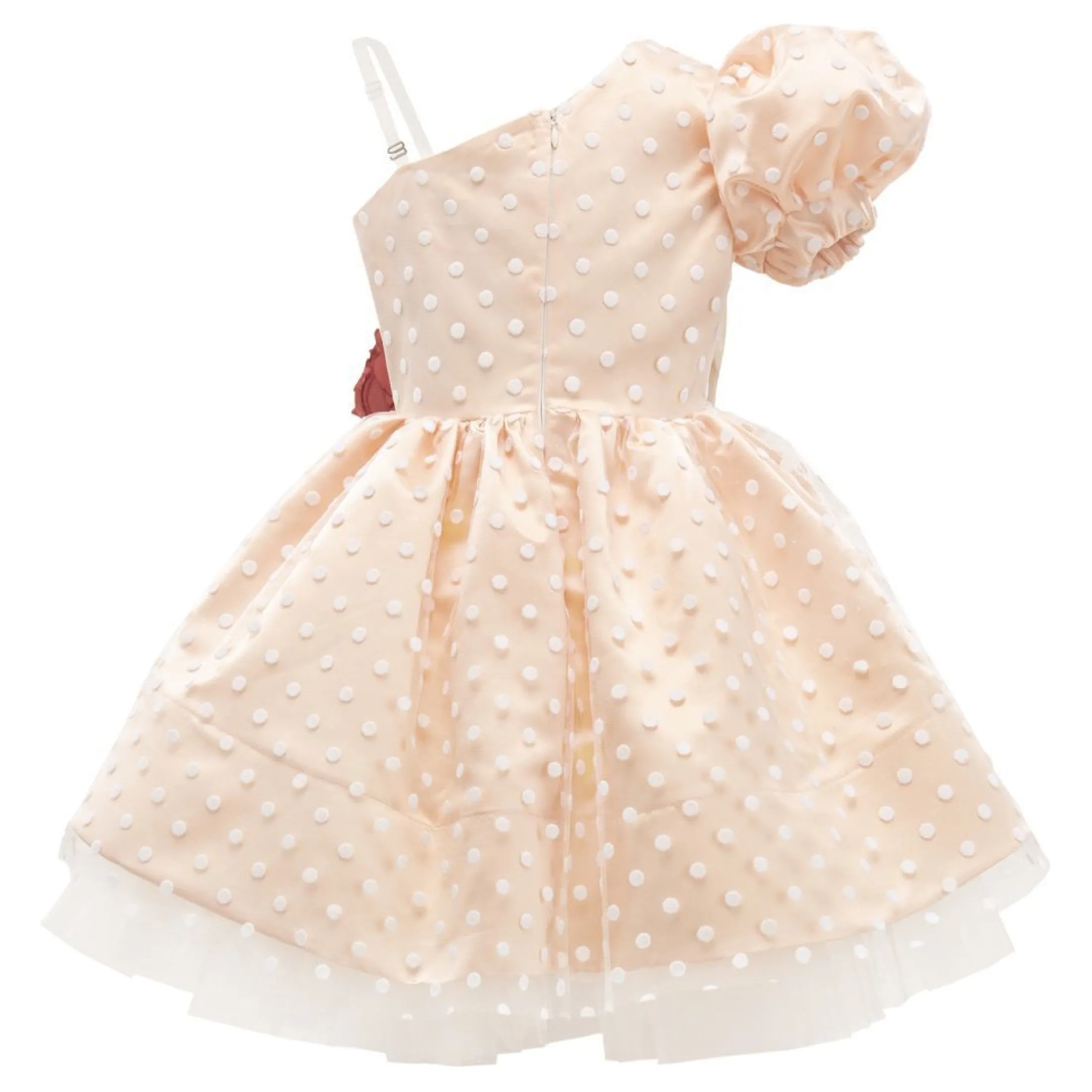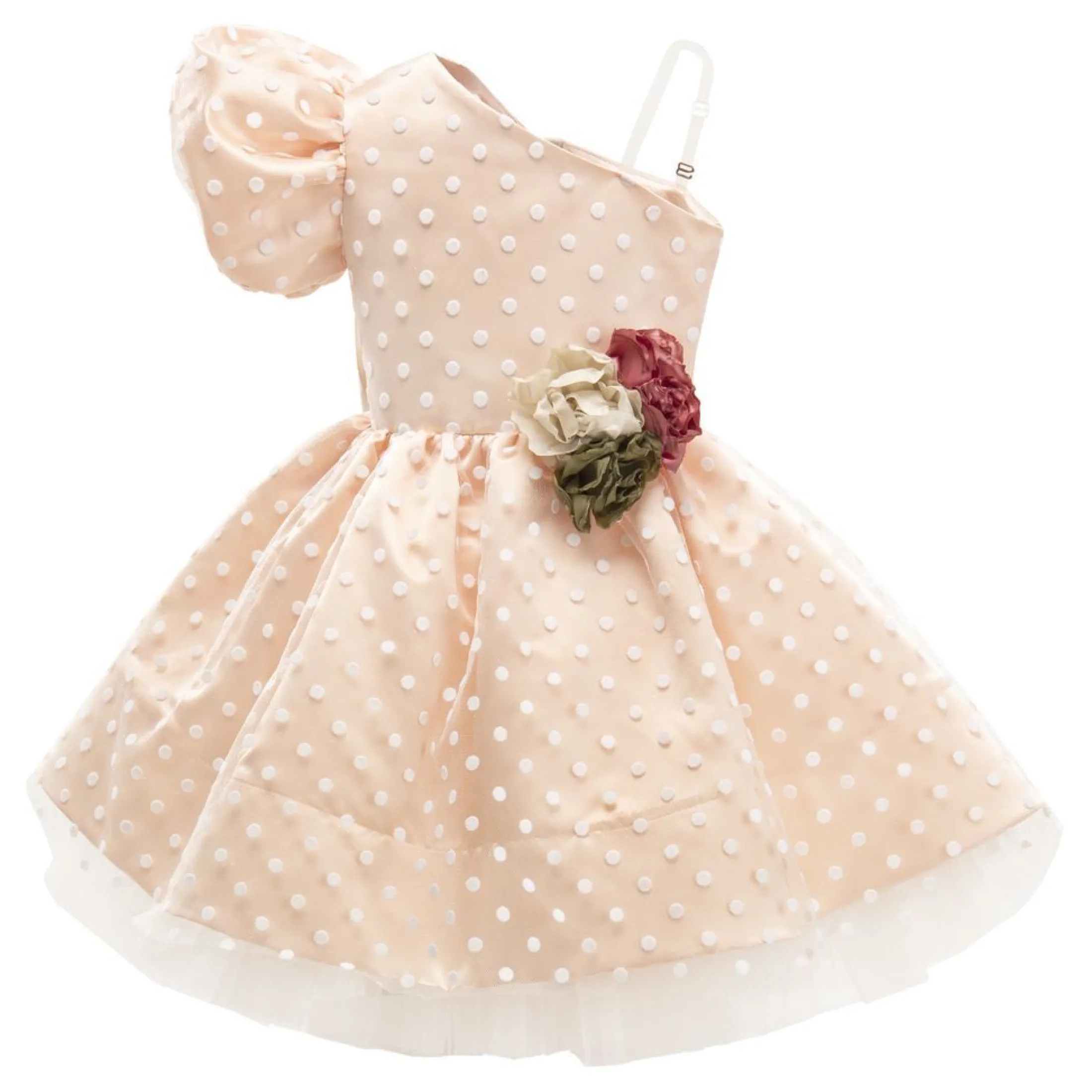 This peach off shoulder polka dot dress is simply precious, featuring an assymetric shoulder collar, adorned with a beautiful multicolor rose assortment adjacent to the hip, leading to a layered continuation of the polka dot patteern to create the perfect princess silhouette.